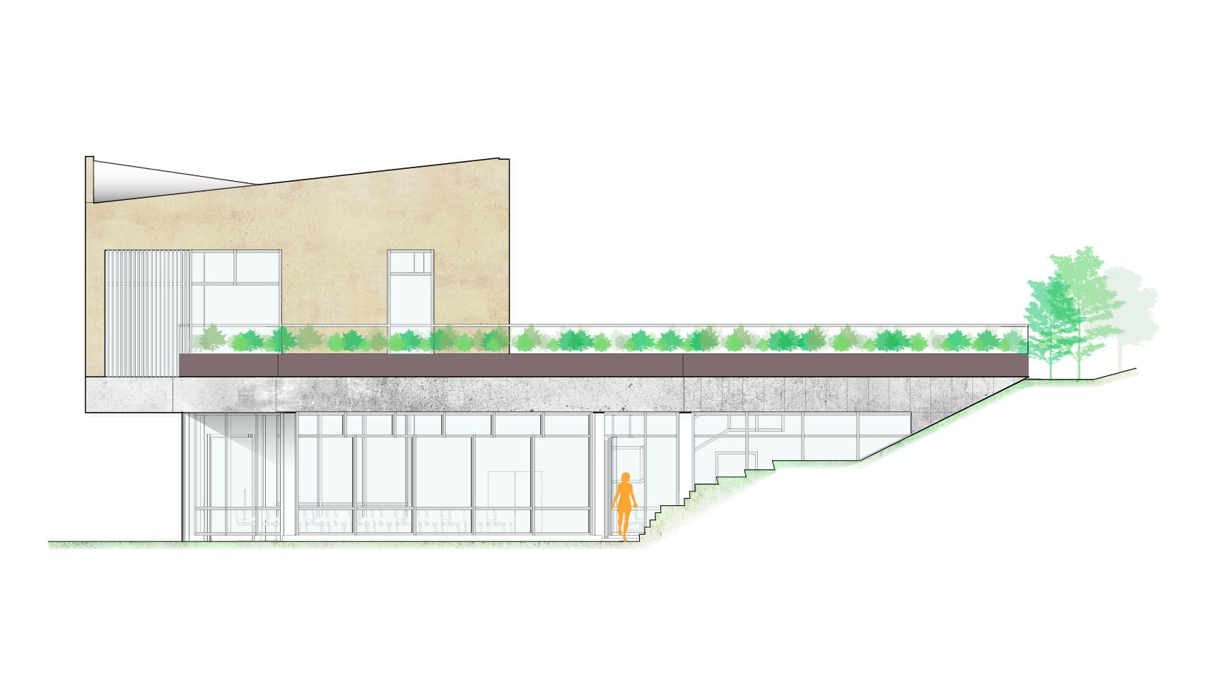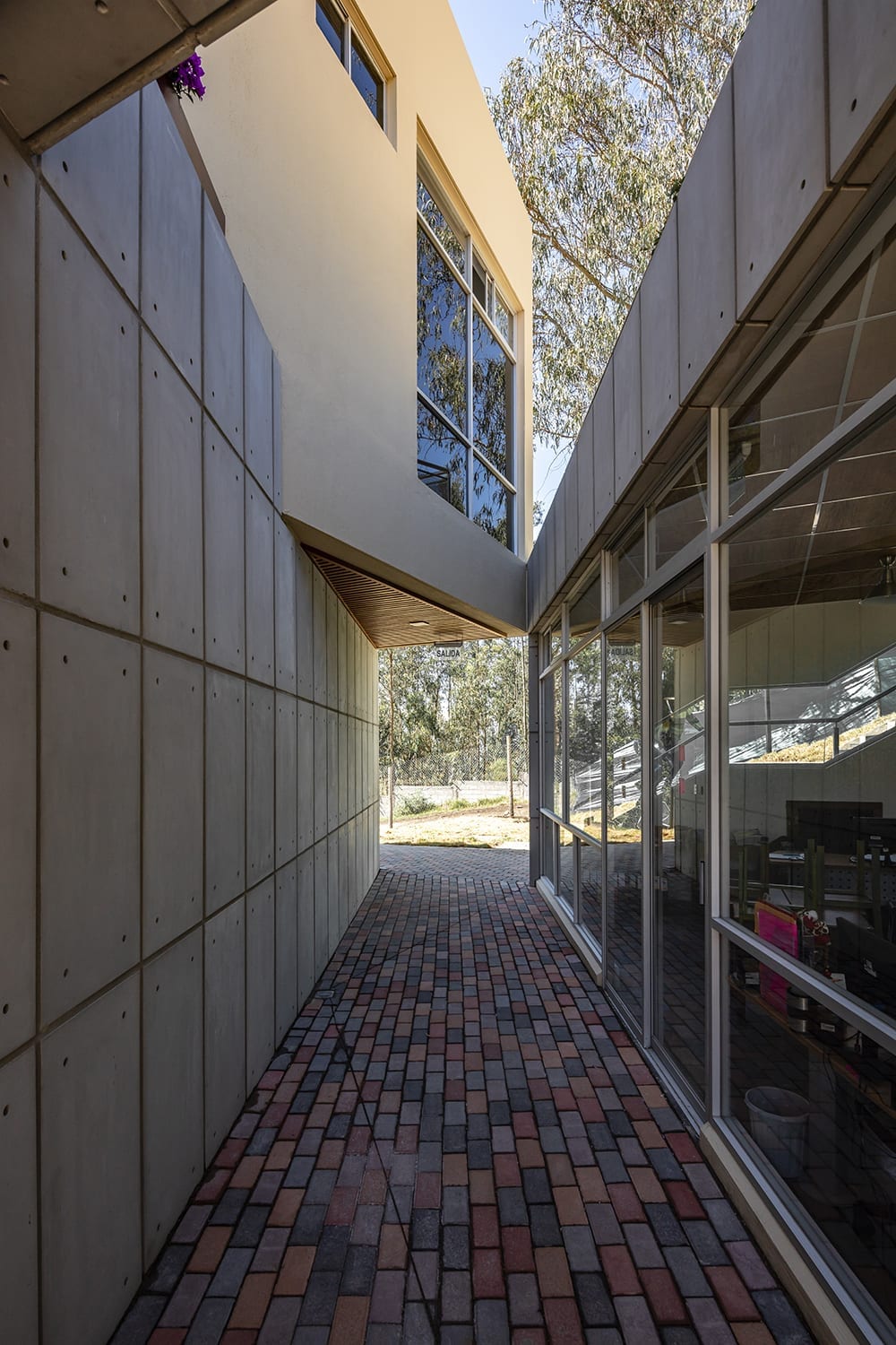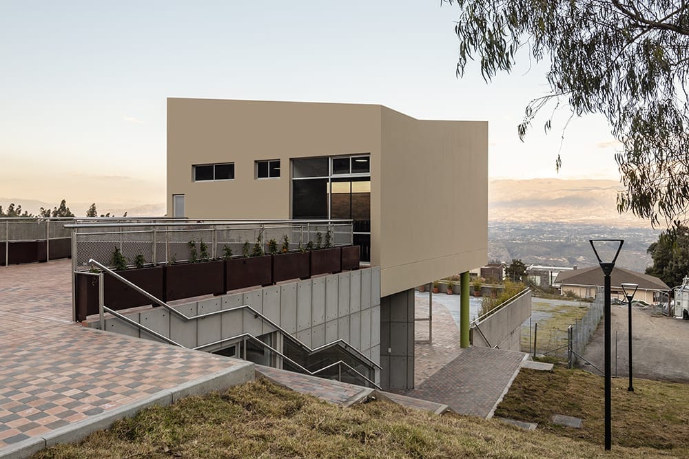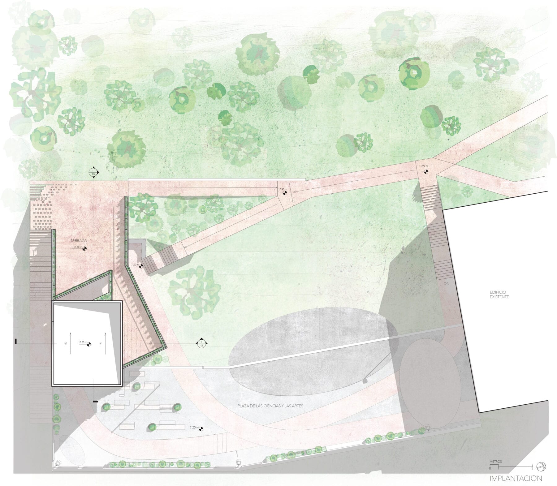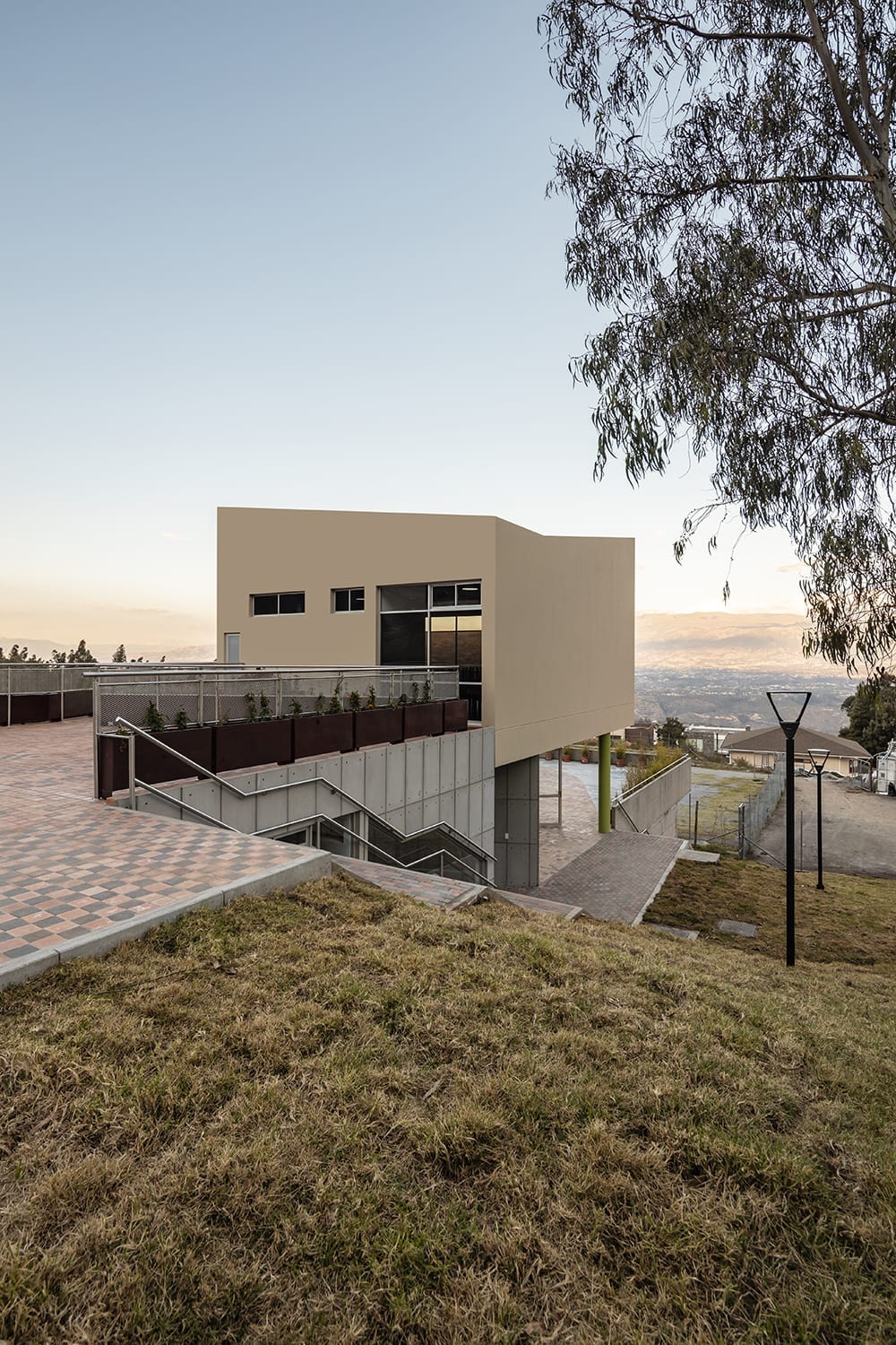 The building is composed of three classrooms, a meeting room, storage areas, a terrace for outdoor activities and an open square, intended to be the heart of the school. The project adapts to the environment through its insertion into the topography, it has a direct connection at the ground floor level with the plaza and at the top floor level with the green areas. The project sees the environment as an integral element of the educational experience through learning “above” and “within” the environment. That is why the existing circulation system of the school, through ramps, and the way they relate to the topography formed the most determining factors at the time of design. We were interested in reinforcing the condition of passing “through” and “under” the building, so the external circulations of the project is the integrating element.