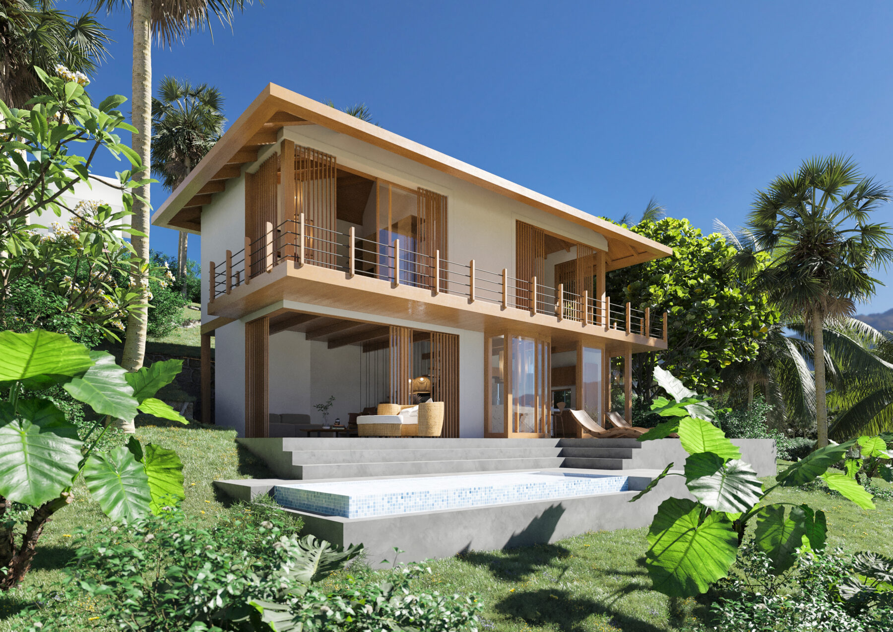 The spacious guest villages can be opened up completely to a personal terrace with an ocean view to the front and are surrounded by gardens with tropical plants in the rear. They count with an incorporation of an open kitchen setup which provides a modern and unique ambiance to traditional architectural elements. The floor-to-ceiling doors have direct openings to the exterior and connect the interior areas of the village with the rest of the environment. This project represents the first phase of of a project that will have more little villages and new amenities in the future.