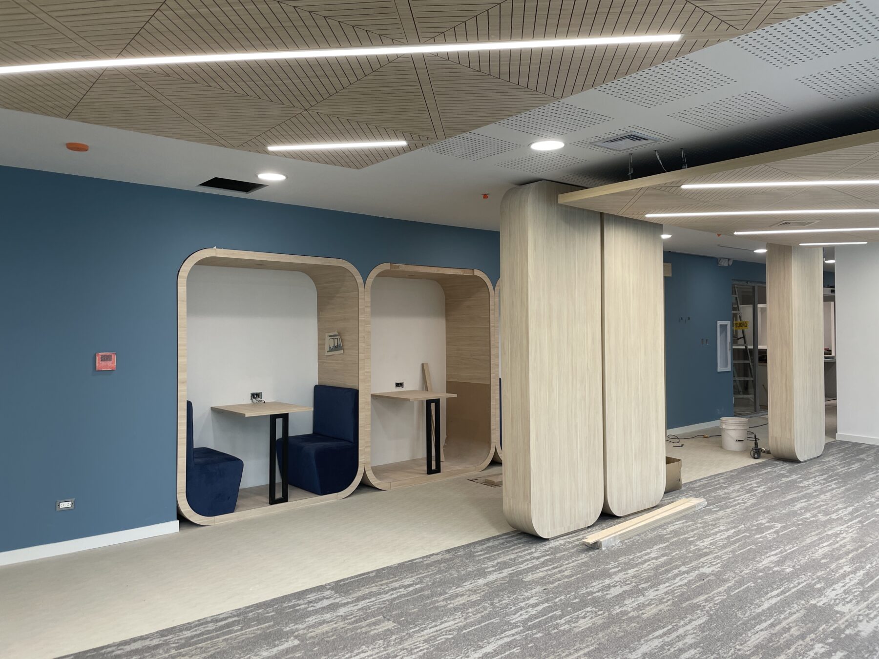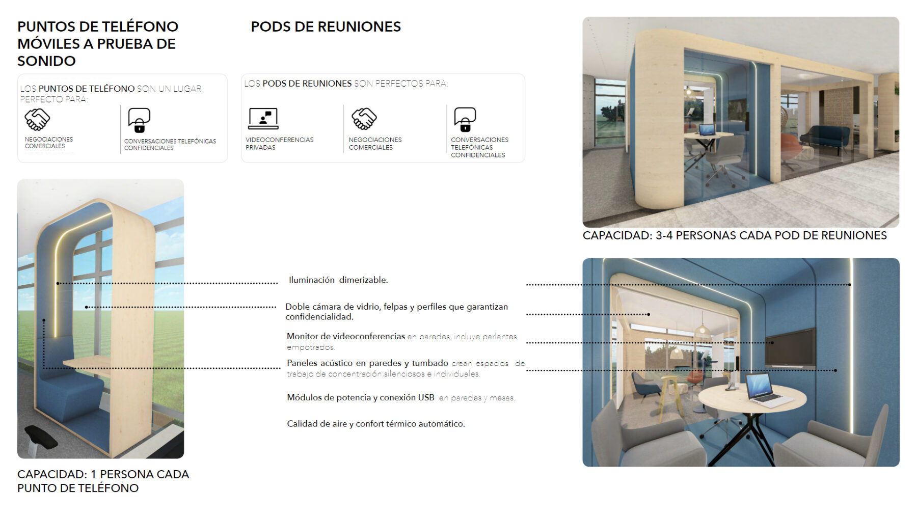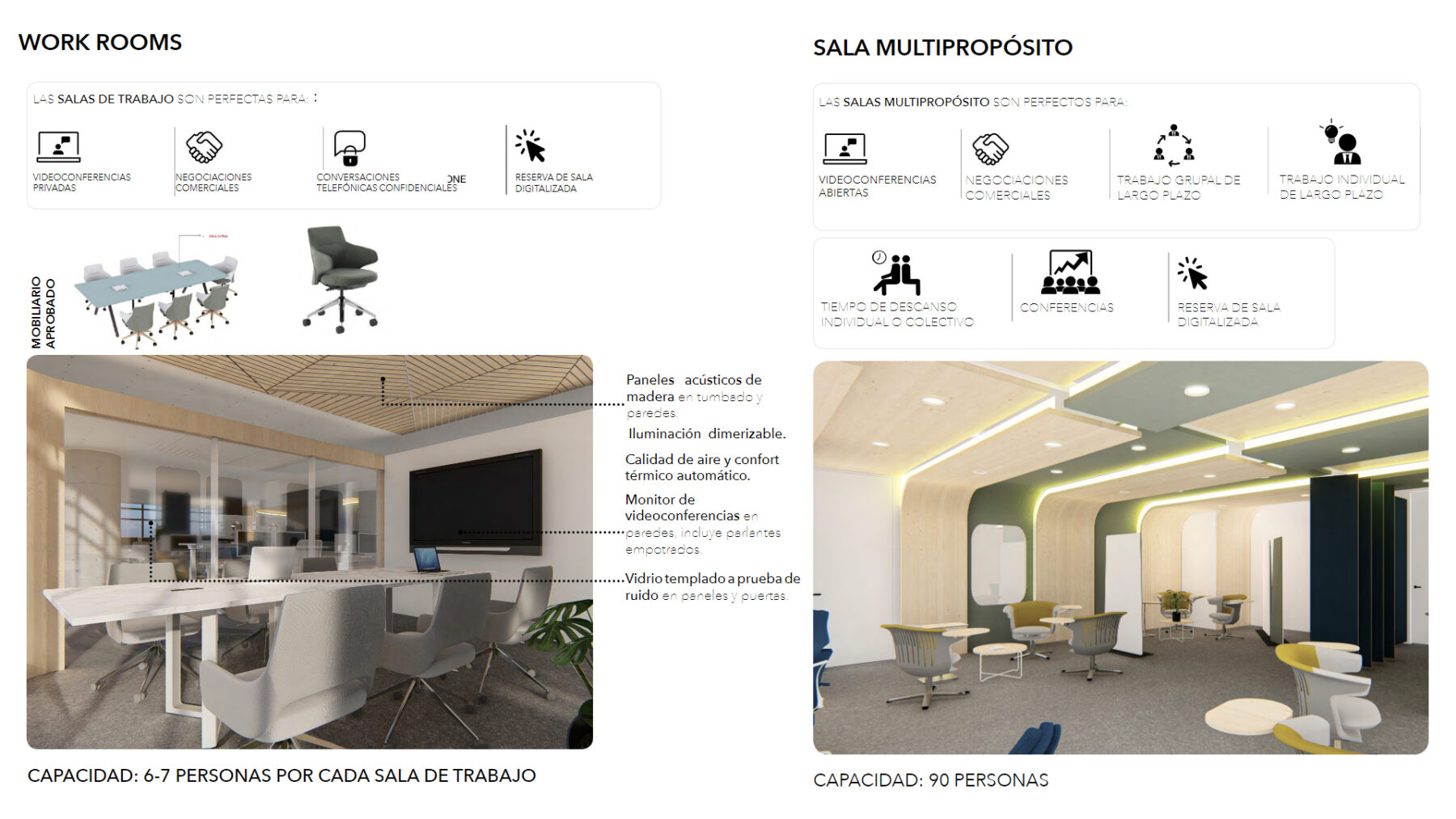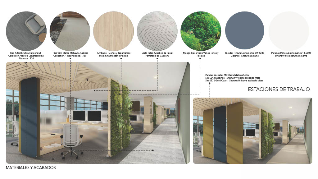 We wanted to renew the office concept, since lately all the spaces have had to be rethought due to the Covid-19 situation. For this reason we began to analyze the necessary requirements to create a functional space. The main objective was to design a space where people can feel good and safe. This offices incorporate a concept of flexible spaces with vertical mobile panels which allow individual work spaces to be large or slightly smaller according to the need or to the group of people. Additionally, it includes shapes that reflect more organic and people-friendly elements. Therefore, there is an emphasis on curved elements, curved walls within the space in order to have a little more fluidity.