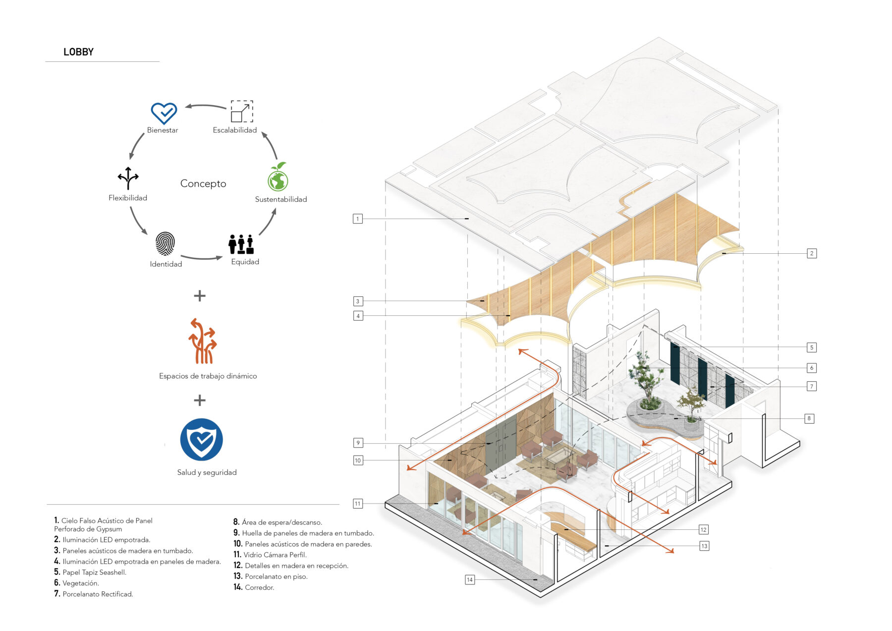 These new offices were designed in the transition process towards an office model which, above all, pays special attention to the welfare and safety of the workers. The office design resumes its trend towards open and shared spaces with an ingredient of collaboration, socialization, and connection to technological tools. It has been designer to provide a flexible environment through silent and private spaces, as well as collaborative spaces such as meeting rooms and rest areas. This to increase productivity, health, and provide safety for the occupants. Since the project is located in Ecuador, it counts with a good and sustainable wood industry with a wide range of options including wicker, which is a vegetable fiber obtained from a shrub in the salix willow family. It is a characteristic material from the province of Manabí and it can be found it in furniture, lamps and baskets. Basketry and wicker are included not only because of the natural properties it provides to the space but also as an element of local identity.