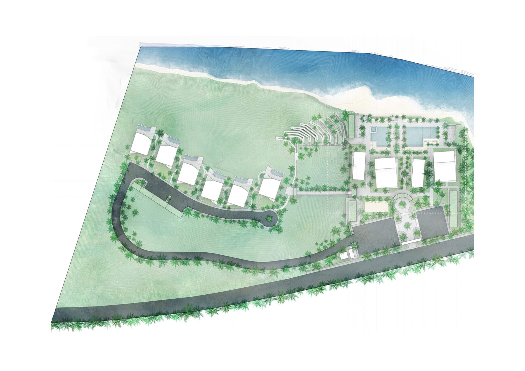 Rampiral is located on the Pacific coast on the beach of Same province of Esmeraldas north of Ecuador. Located on a plot of 36’394m2 with a front of 254m facing the sea. It includes 7 buildings. A total of 28 apartments. The intention of this preliminary project is to present a design with modern, welcoming spaces and with visual connection to the natural surroundings.