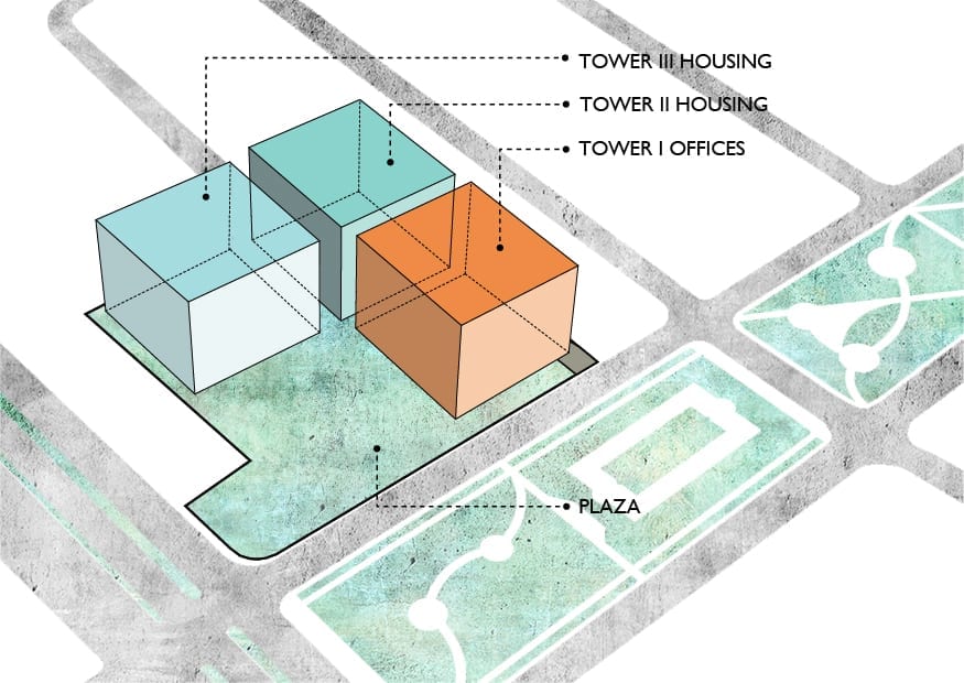 El proyecto responde a su sitio a través de la implementación de volúmenes que forman una plaza, que extienden el parque lineal frente al sitio.