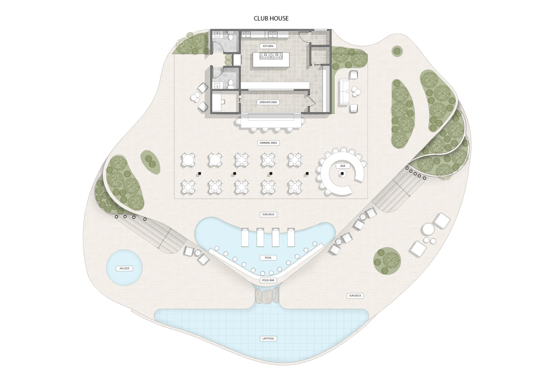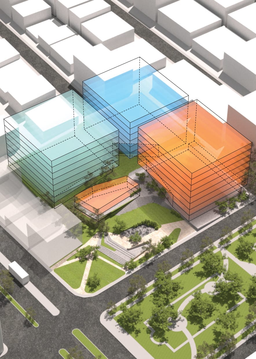 El proyecto responde a su sitio a través de la implementación de volúmenes que forman una plaza, que extienden el parque lineal frente al sitio.