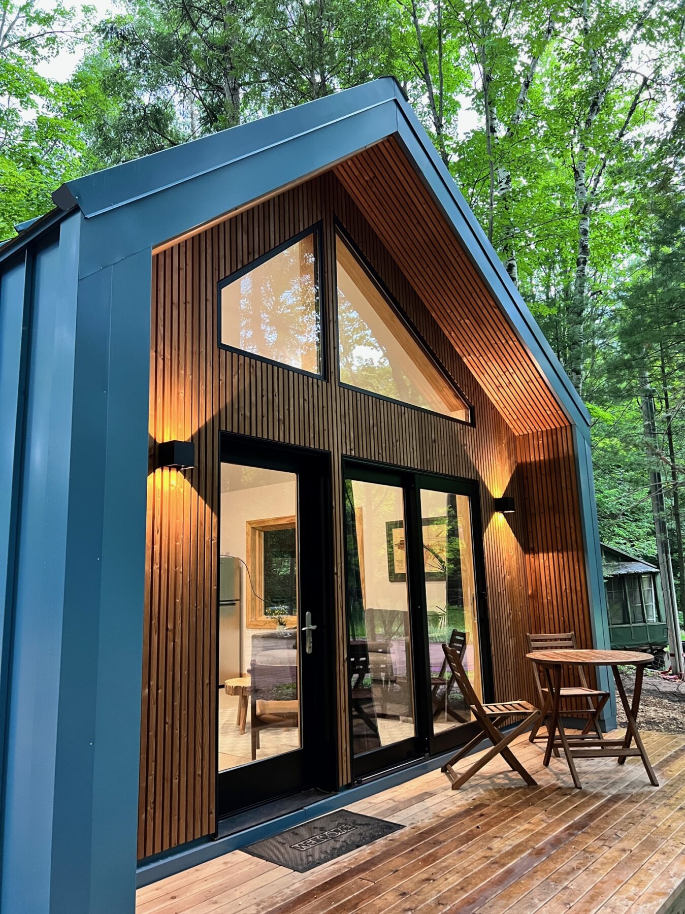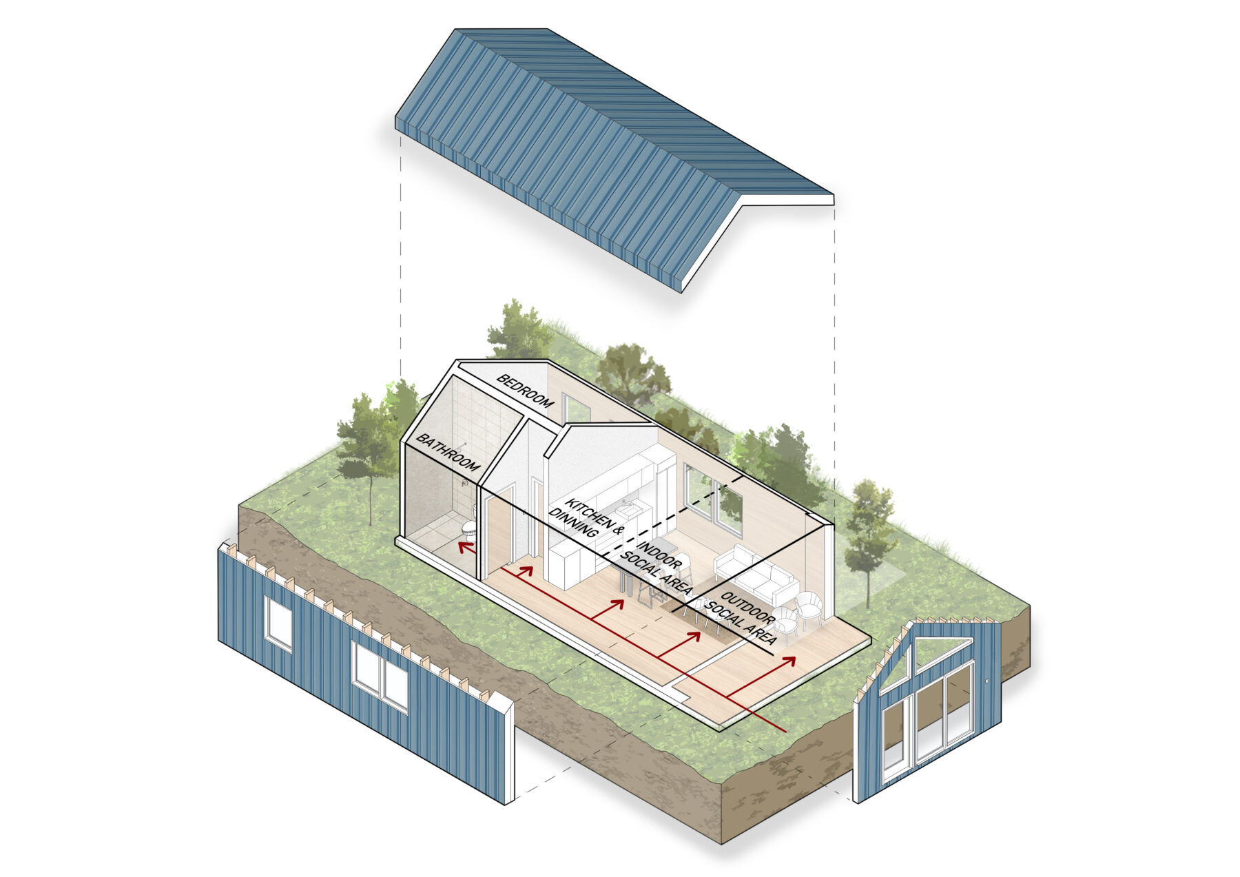 Este proyecto tiene como objetivo crear un espacio conformado por cabañas modulares. Cada cabaña se puede adaptar fácilmente en el sitio y ha sido diseñada para maximizar el uso del espacio mientras conecta al usuario con la naturaleza y el paisaje al aire libre. Estas unidades modulares consisten en marcos de madera con una fachada de metal en los lados. El volumen principal está compuesto por un techo a dos aguas y un panel frontal de vidrio que permite que el espacio interno se fusione con el ambiente exterior.