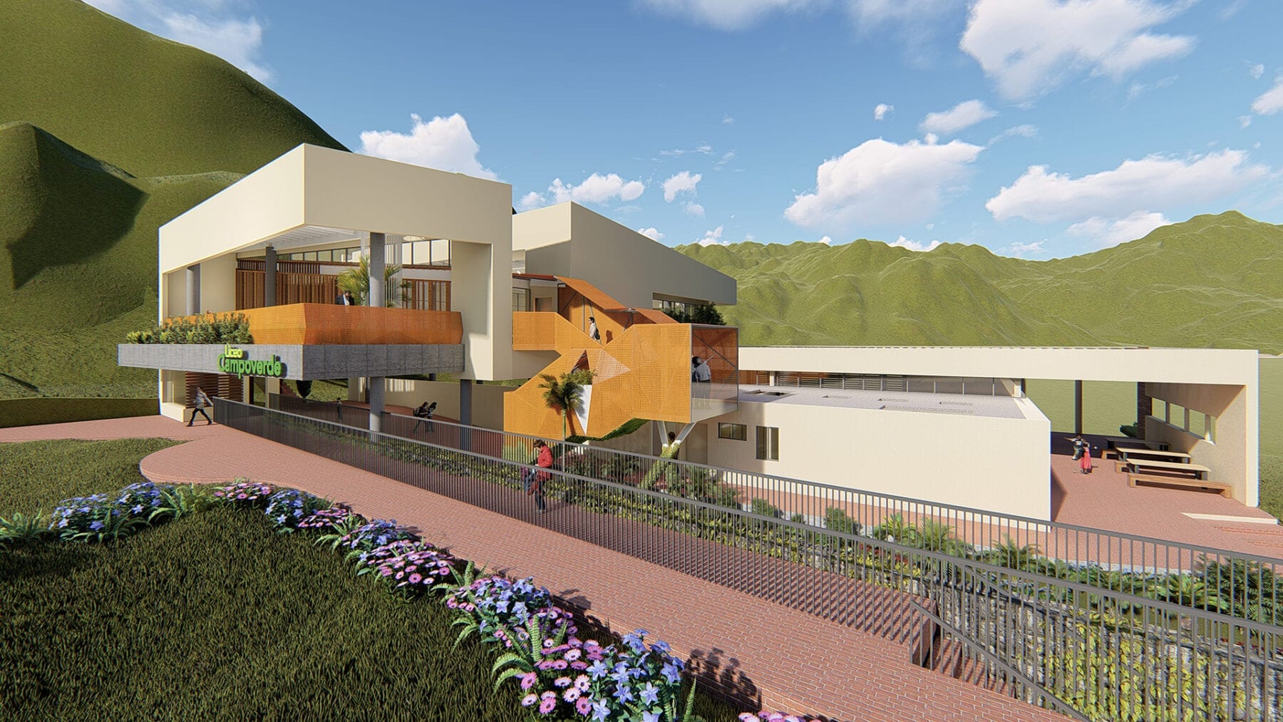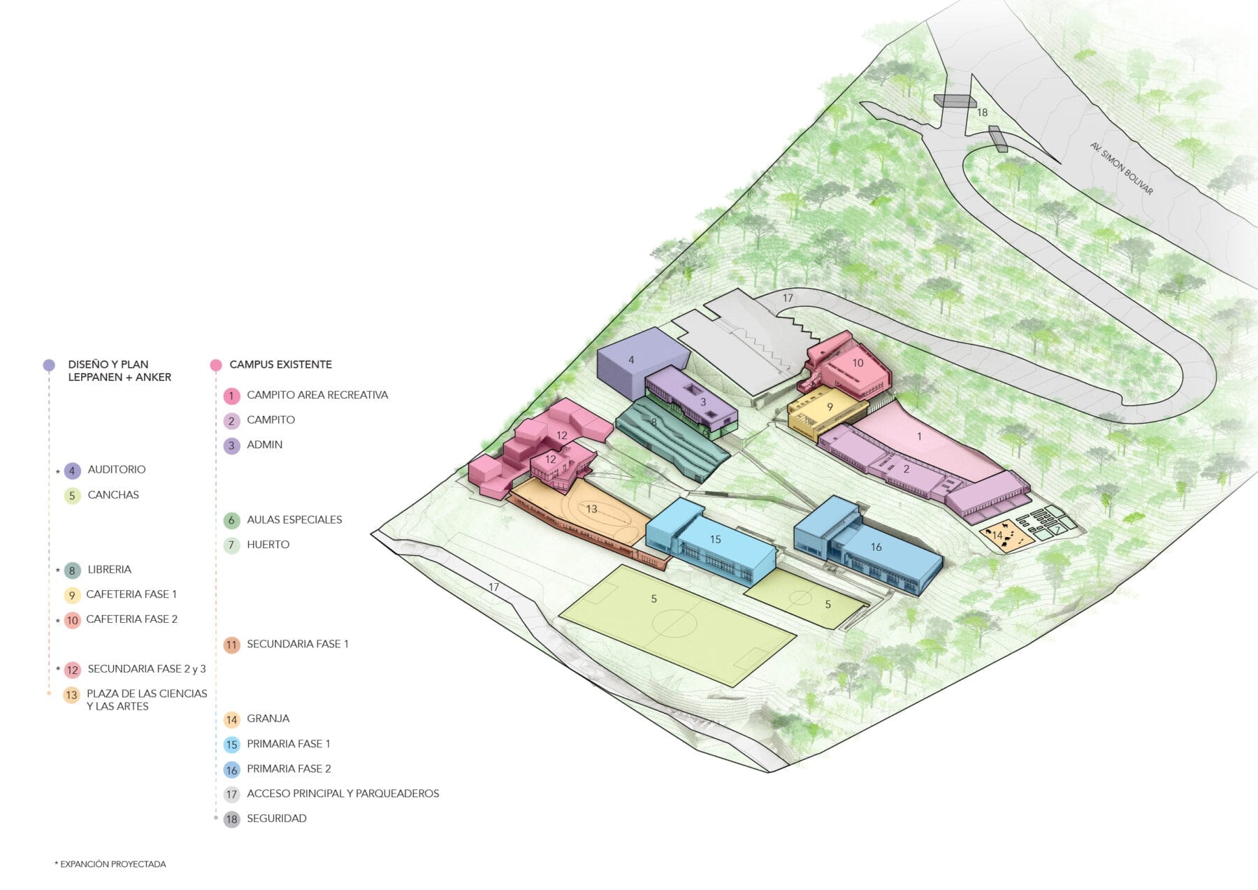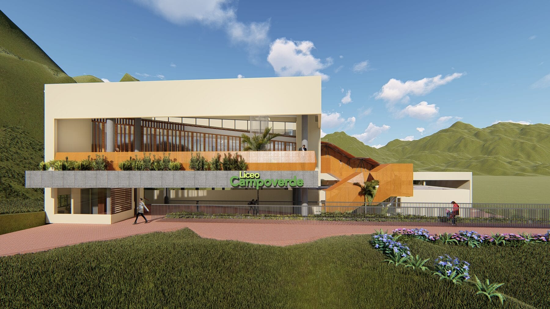 Liceo Campoverde es una escuela ubicada en un valle cerca de la capital. Su objetivo principal es promover la sostenibilidad a través de métodos educativos y constructivos. Leppanen Anker recibió el encargo de desarrollar un plan maestro para la expansión de la escuela que incluye una biblioteca, cafetería, auditorio, bloque para la escuela secundaria y varias áreas al aire libre.