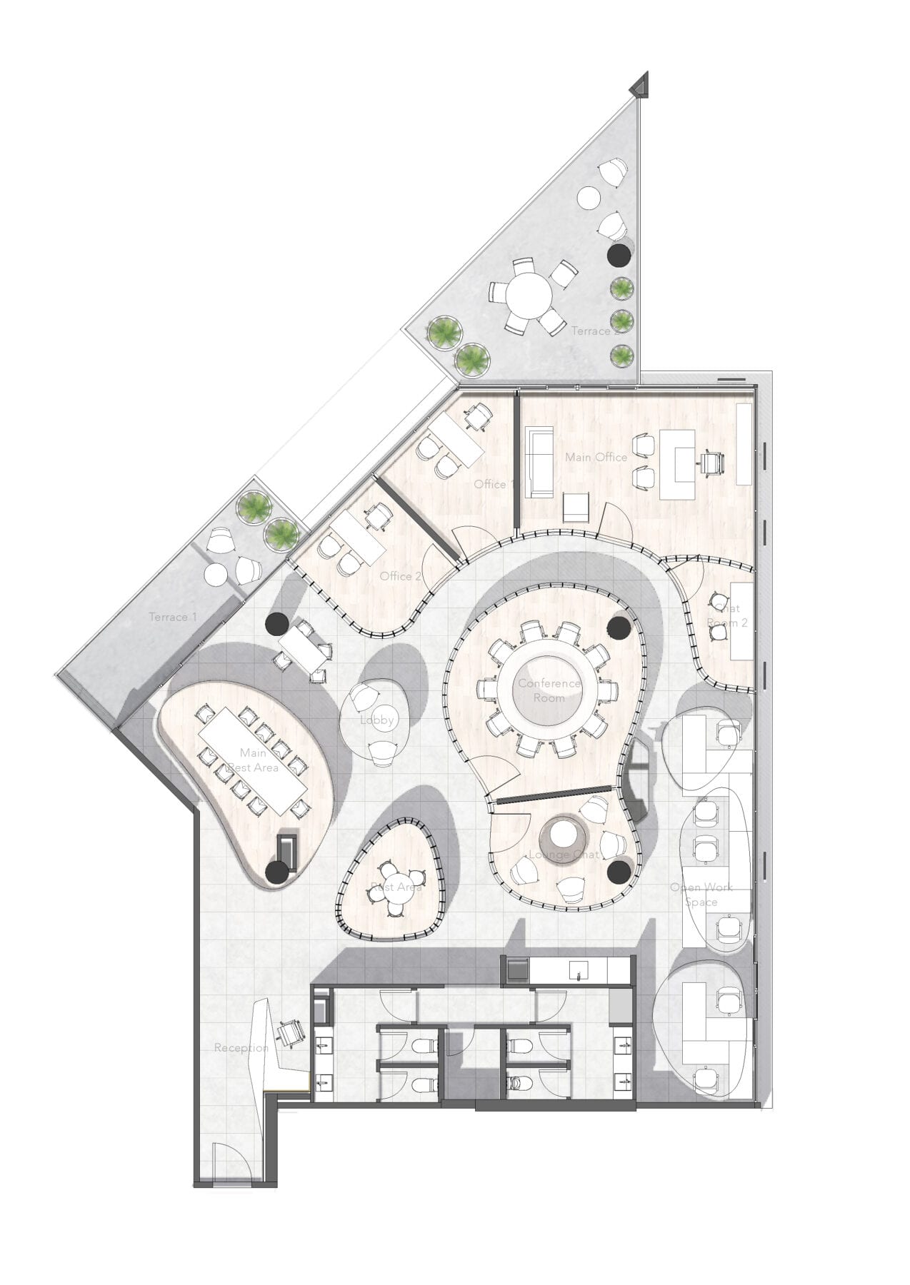 Es un espacio de trabajo cuyo concepto arquitectónico es la fluidez orgánica, que distribuye las áreas privadas y abiertas para crear es espacio moderno y limpio. Sus formas curvas permiten dar un giro a la oficina tradicional creando nuevos ambientes para sus usuarios.