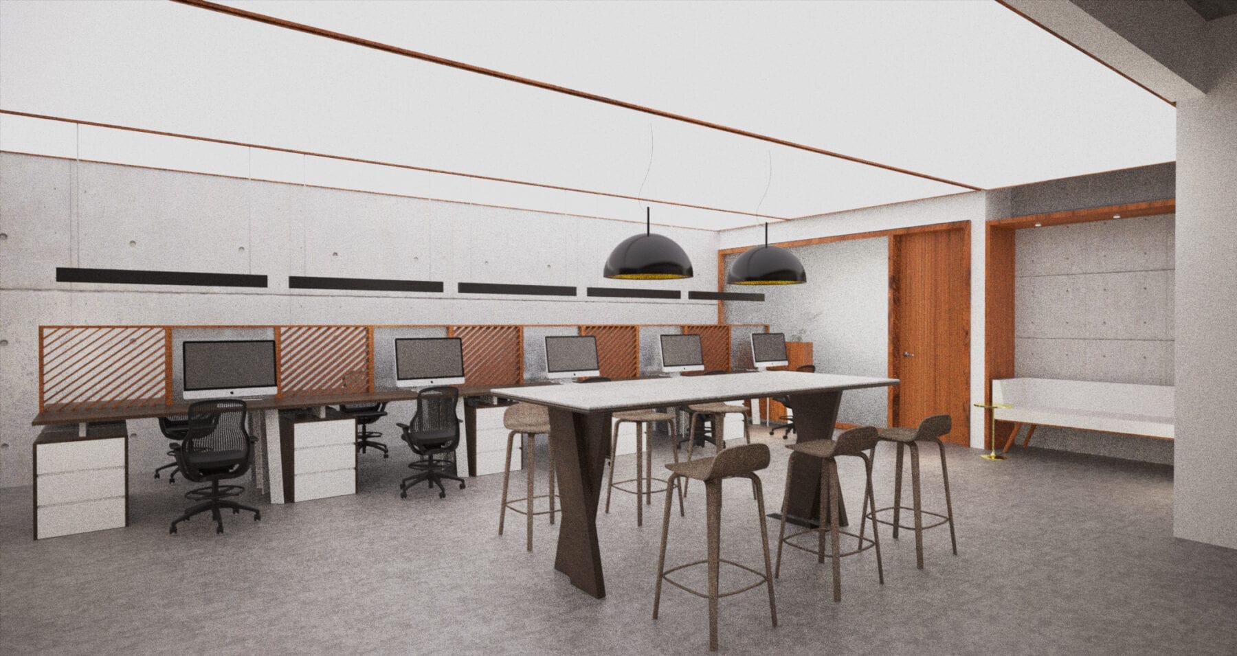 Con una delicada selección de materiales se logra que cada espacio sea acogedor y adecuado para una buena productividad. Con un metraje aproximado de 560 metros cuadrados donde se emplazan oficinas abiertas, áreas de trabajo comunales salas de reuniones y un lobby acogedor para los clientes.