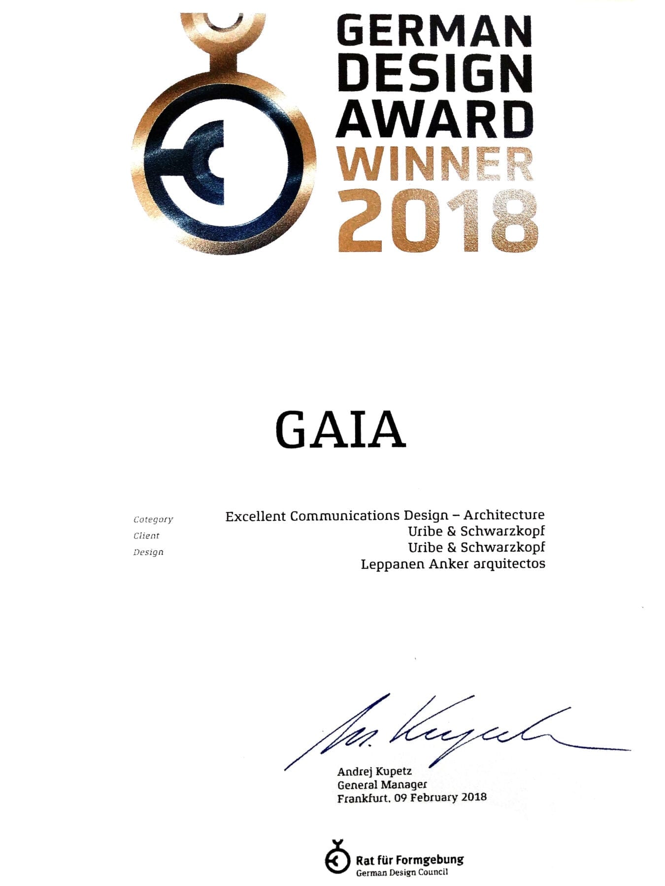 El German Design Award contribuye directamente al éxito comercial en general. Los premios se otorgan a proyectos que realmente representan contribuciones pioneras al panorama del diseño alemán e internacional. El Premio al Diseño Alemán identifica y presenta tendencias de diseño únicas. GAIA fue galardonado con el premio de excelencia en comunicación del diseño arquitectónico.