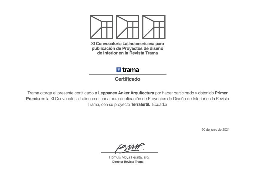 • Primer premio en la XI Convocatoria Latinoamericana para la publicación de Proyectos de Diseño de Interior - Terrafertil / Revista Trama - Ecuador / Junio 2021 I Trama