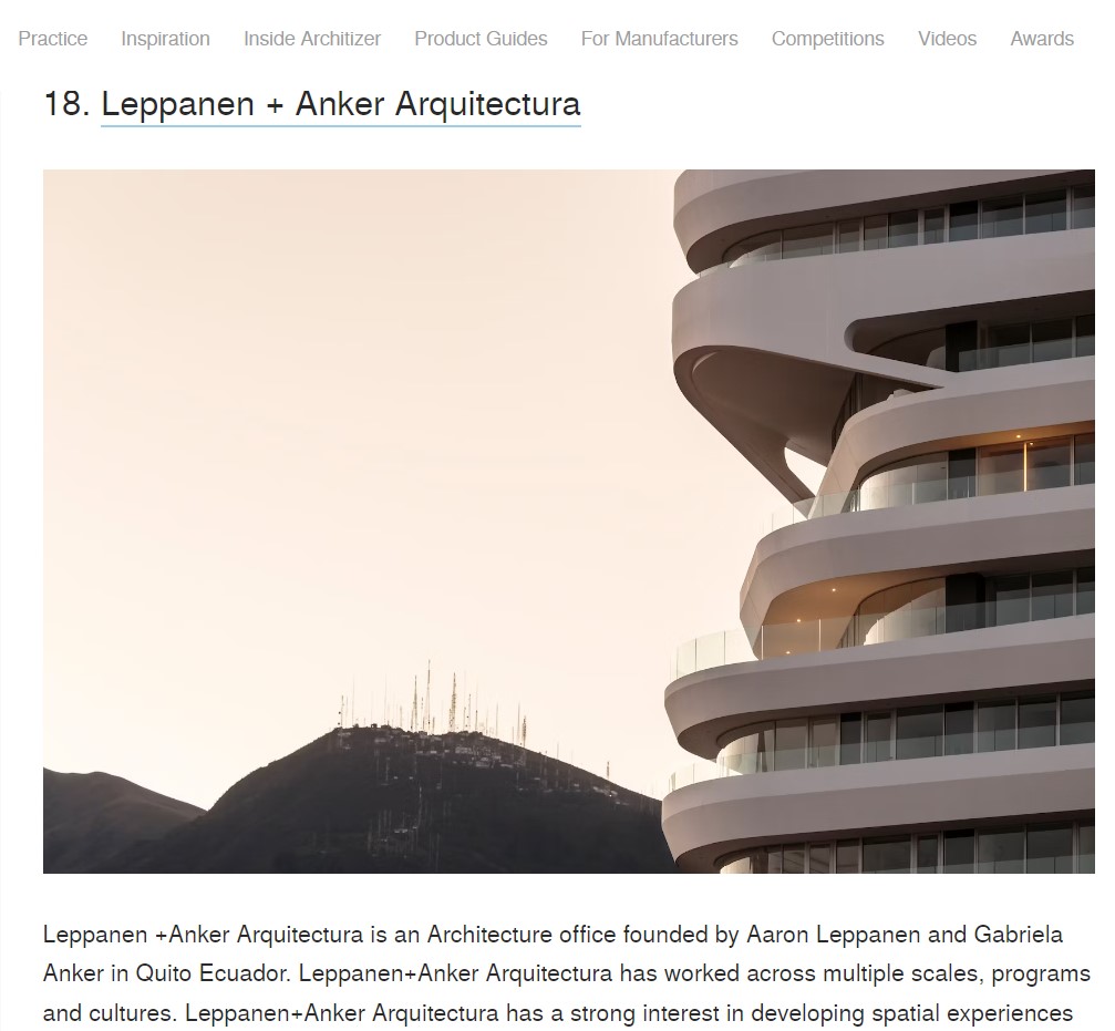 Leppanen Anker en Architizer - "Las mejores 20 firmas arquitectónicas en Ecuador"                    / Publicación en página web