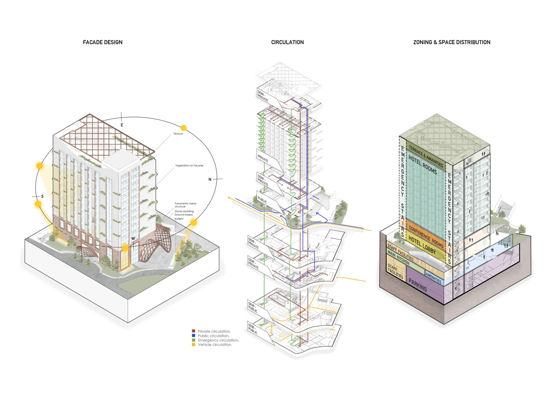 La fachada delantera y trasera incorporan una estructura paramétrica metálica junto con otros elementos que enmarcan las ventanas a lo largo de las diferentes plantas del edificio. El contraste de colores y materiales marcan las diversas actividades que se desarrollarán en el marco del hotel.