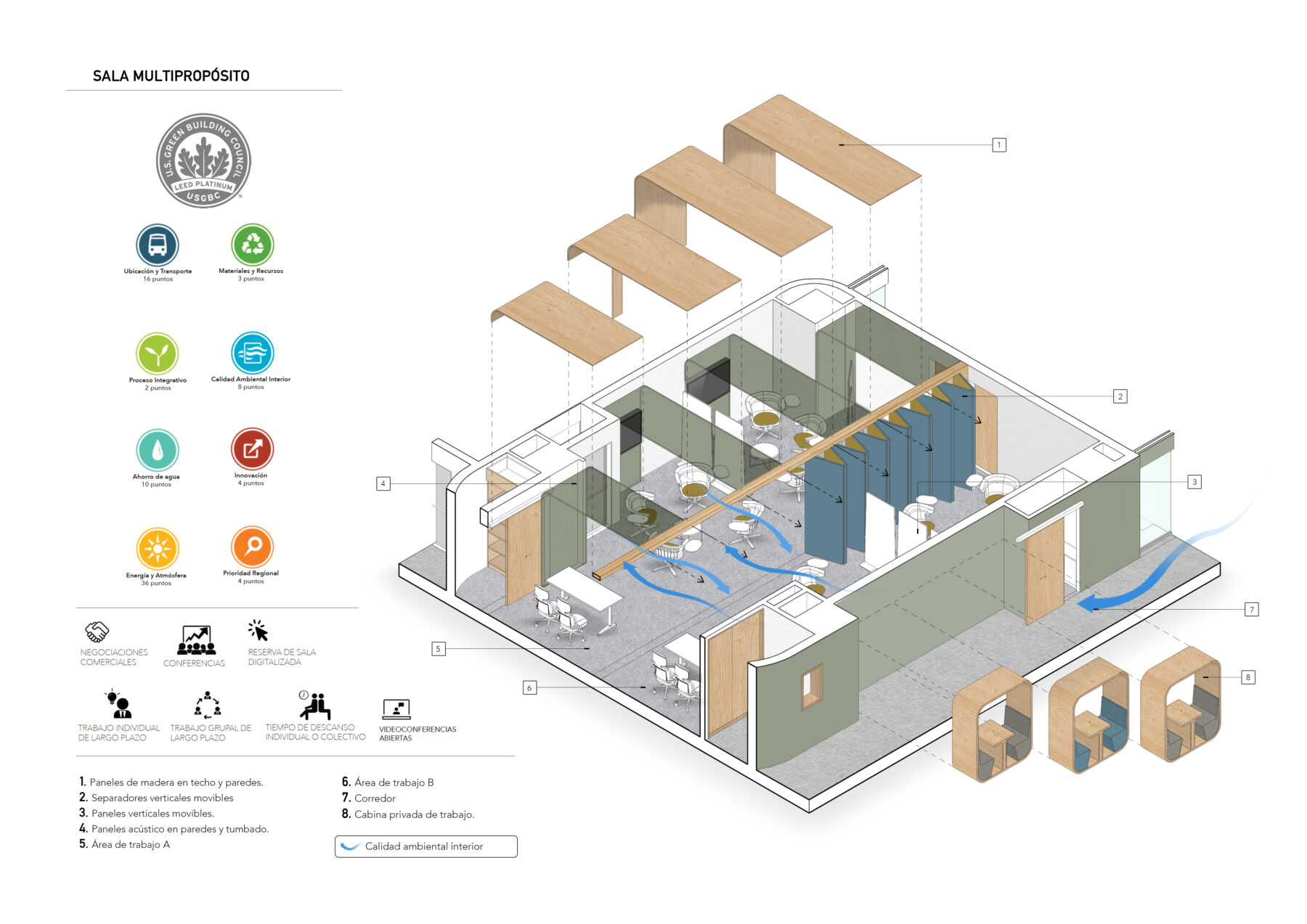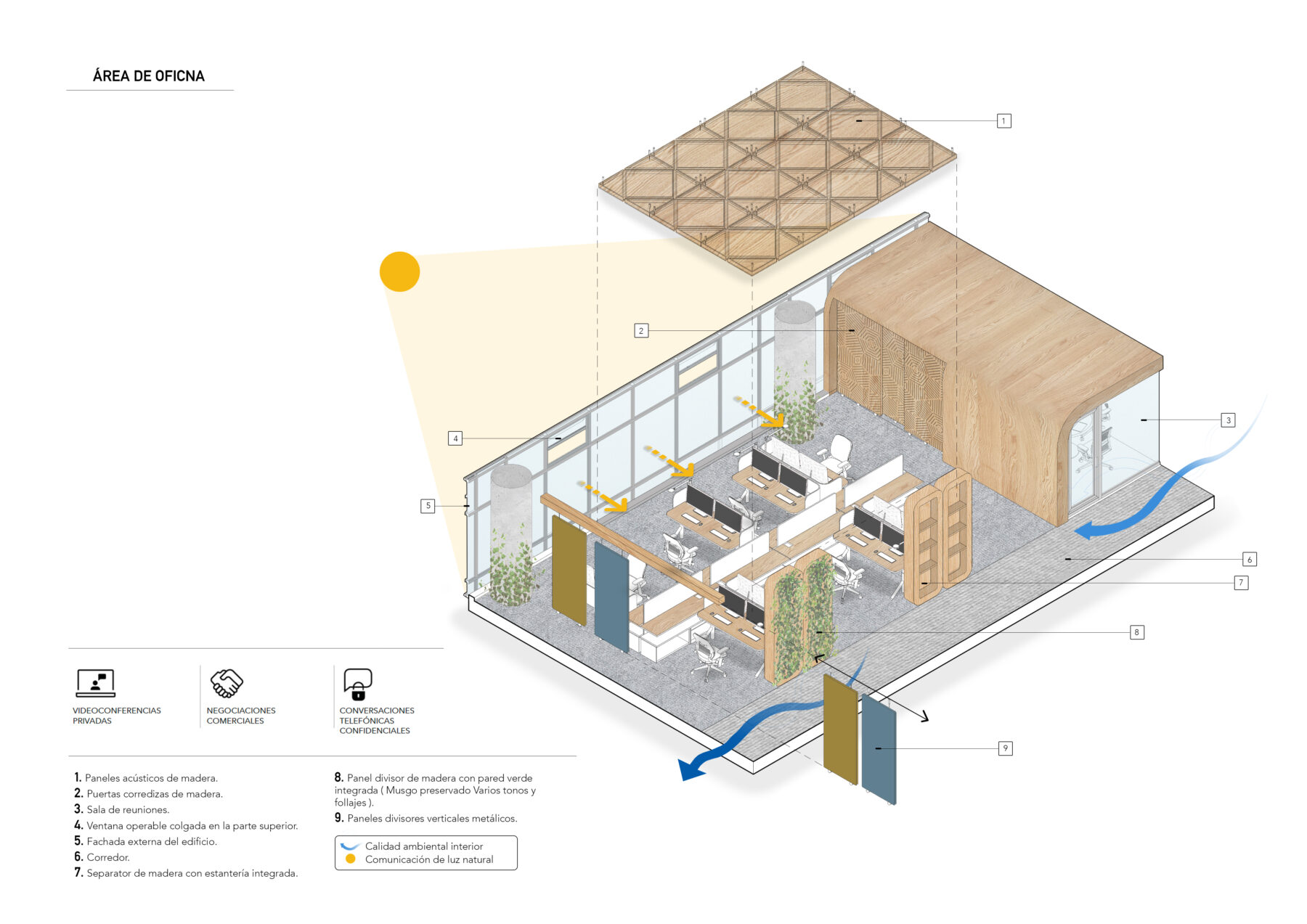 Estas nuevas oficinas se diseñaron en el proceso de transición hacia un modelo de oficina que, ante todo, presta especial atención al bienestar y seguridad de los trabajadores. El diseño de oficinas retoma su tendencia hacia espacios abiertos y compartidos con un propoósito de colaboración, socialización y conexión a herramientas tecnológicas. Donde el diseño crea un ambiente flexible a través de espacios silenciosos y privados, así como espacios colaborativos como salas de juntas y áreas de descanso. Esto para aumentar la productividad, la salud y brindar seguridad a los ocupantes. Dado que el proyecto está ubicado en Ecuador, cuenta con una industria maderera buena y sostenible con una amplia gama de opciones que incluyen el mimbre, que es una fibra vegetal que se obtiene de un arbusto de la familia de los sauces salix. Es un material característico de la provincia de Manabí y se puede encontrar en muebles, lámparas y canastos. La cestería y el mimbre se incluyen no solo por las propiedades naturales que aporta al espacio sino también como elemento de identidad local.