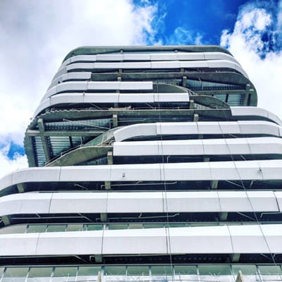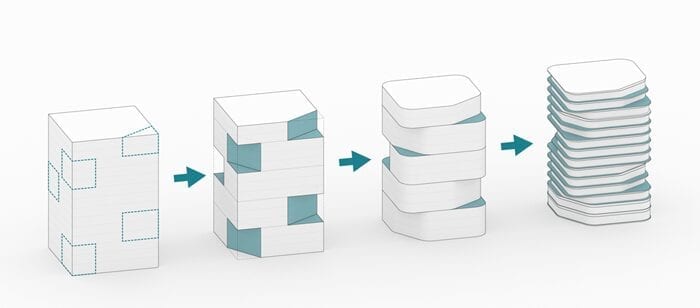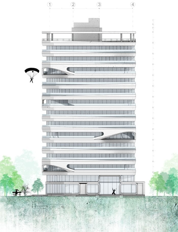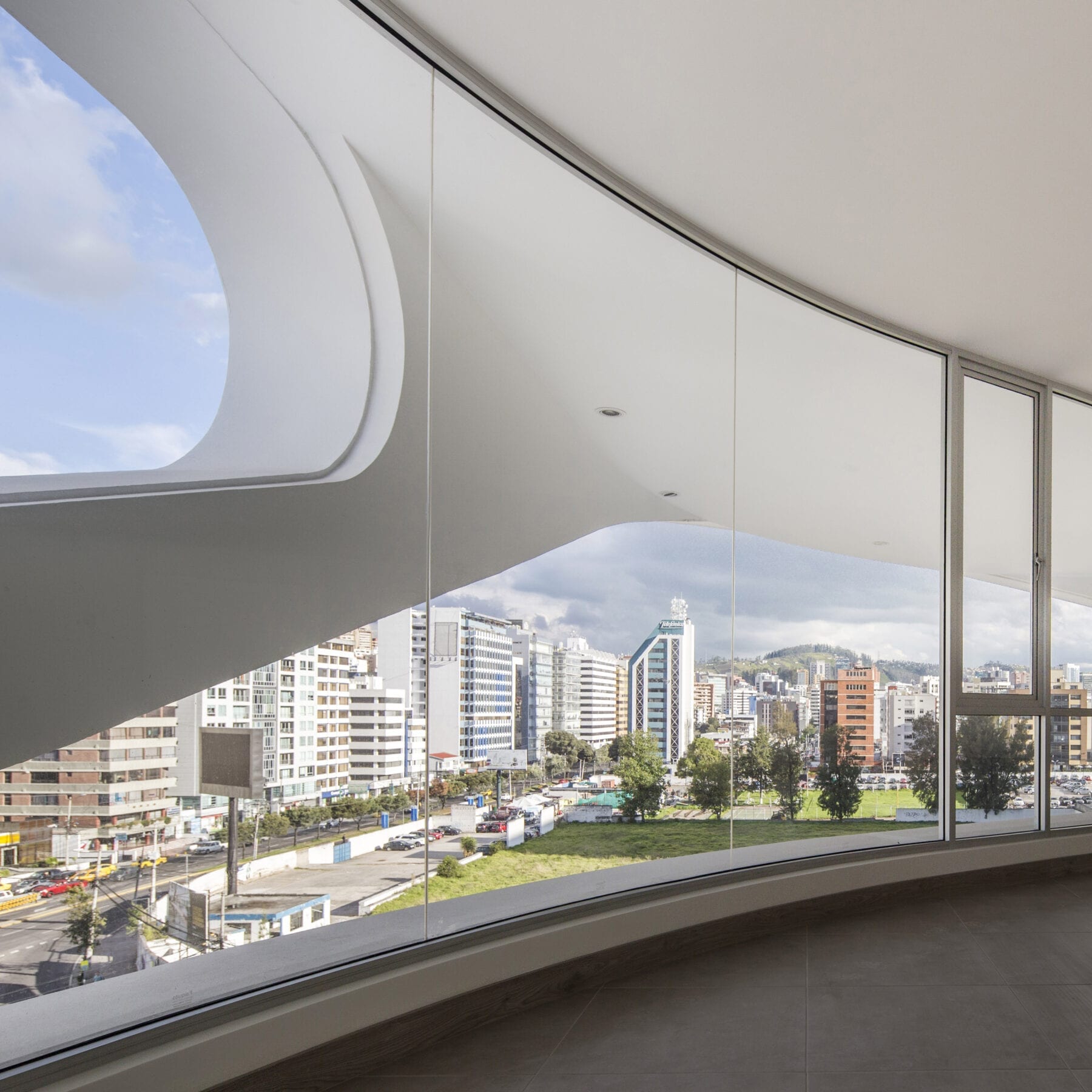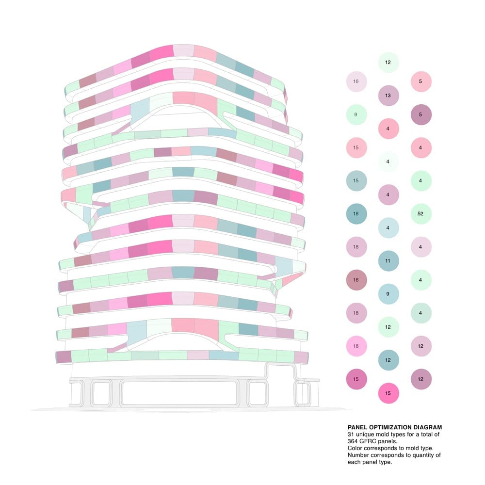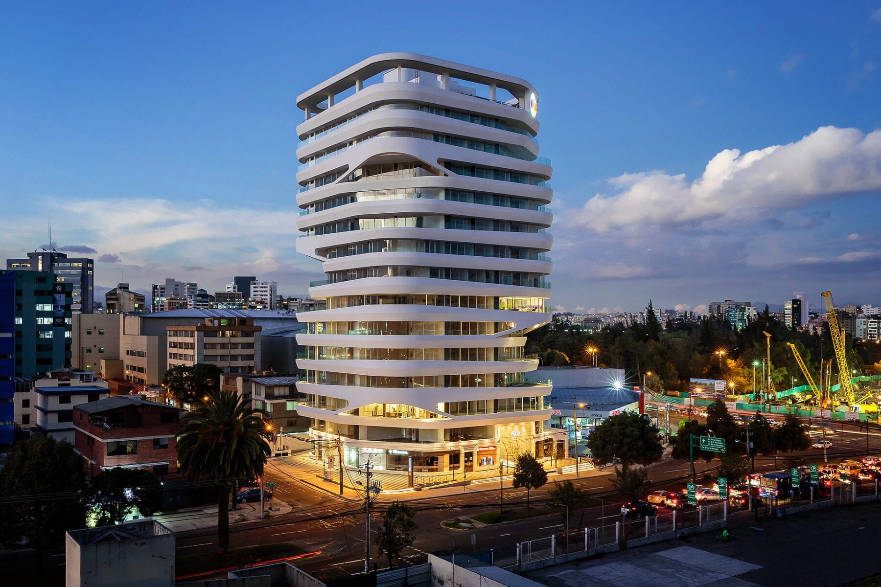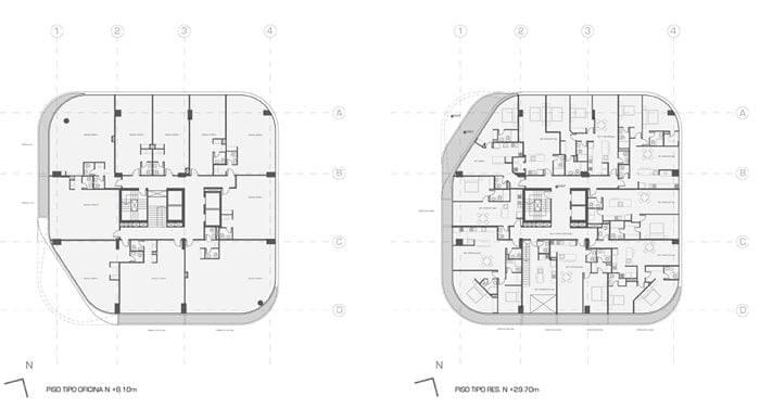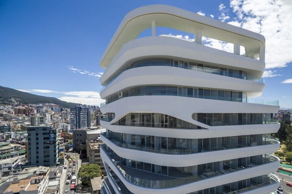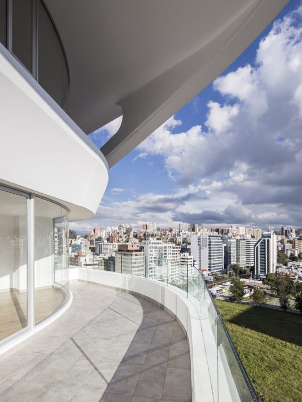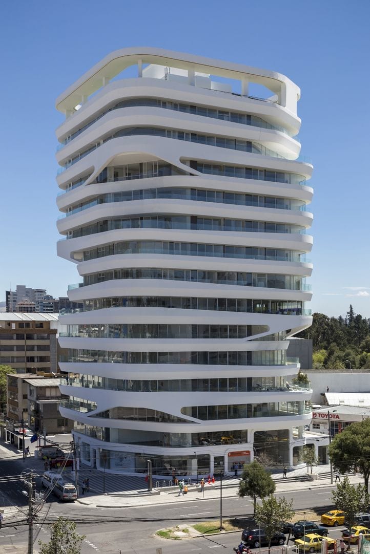 The project manages to activate these exterior areas (originally dead spaces) through different programs. The design and construction process of the building uses a system of repeatable patterns to reduce the total amount of molds used in the creation of the distinctive white facade. The façade uses a material process known as GFRC (reinforced concrete fiberglass), which is sprayed directly on the surface of the mold. The building consisting of a total of 15,000 m2 of multiple use space is crowned by a large roof garden, which is visually connected to the Andes. Together, the fifteen-story tower combines commercial opportunities on the ground floor, offices on the next four levels and residential units on the upper floor.