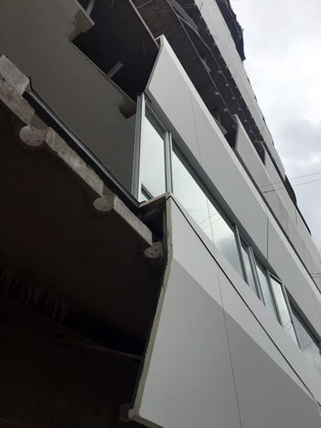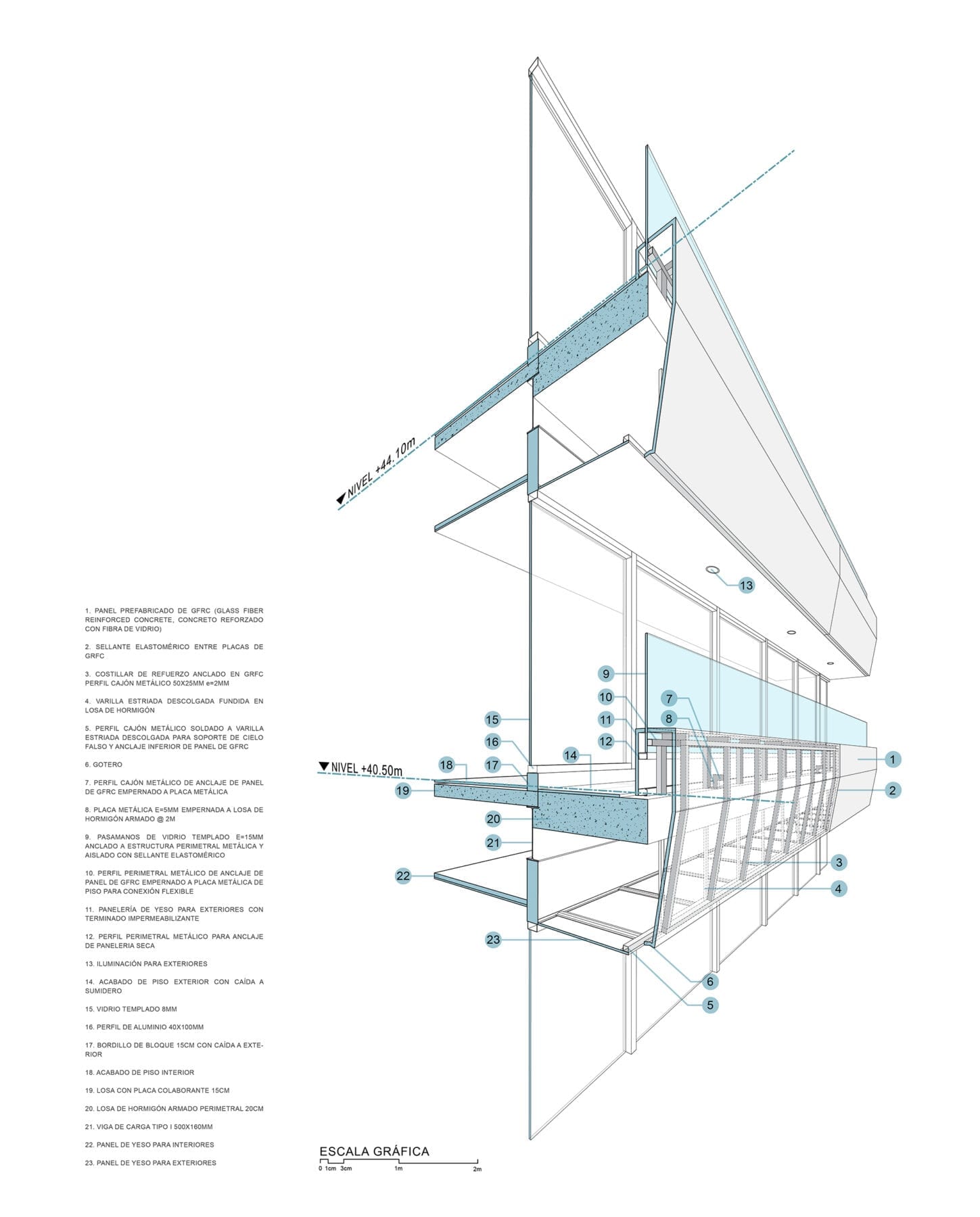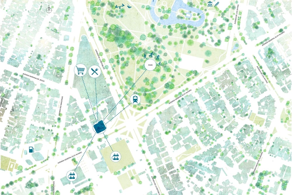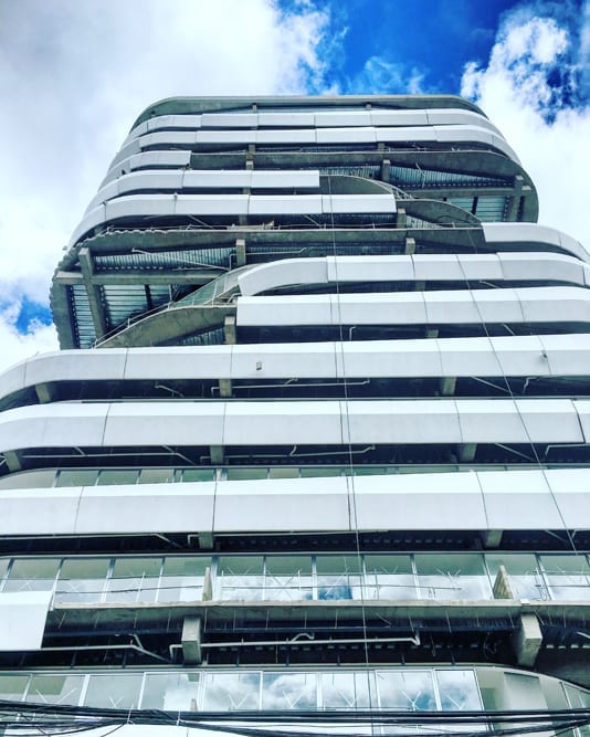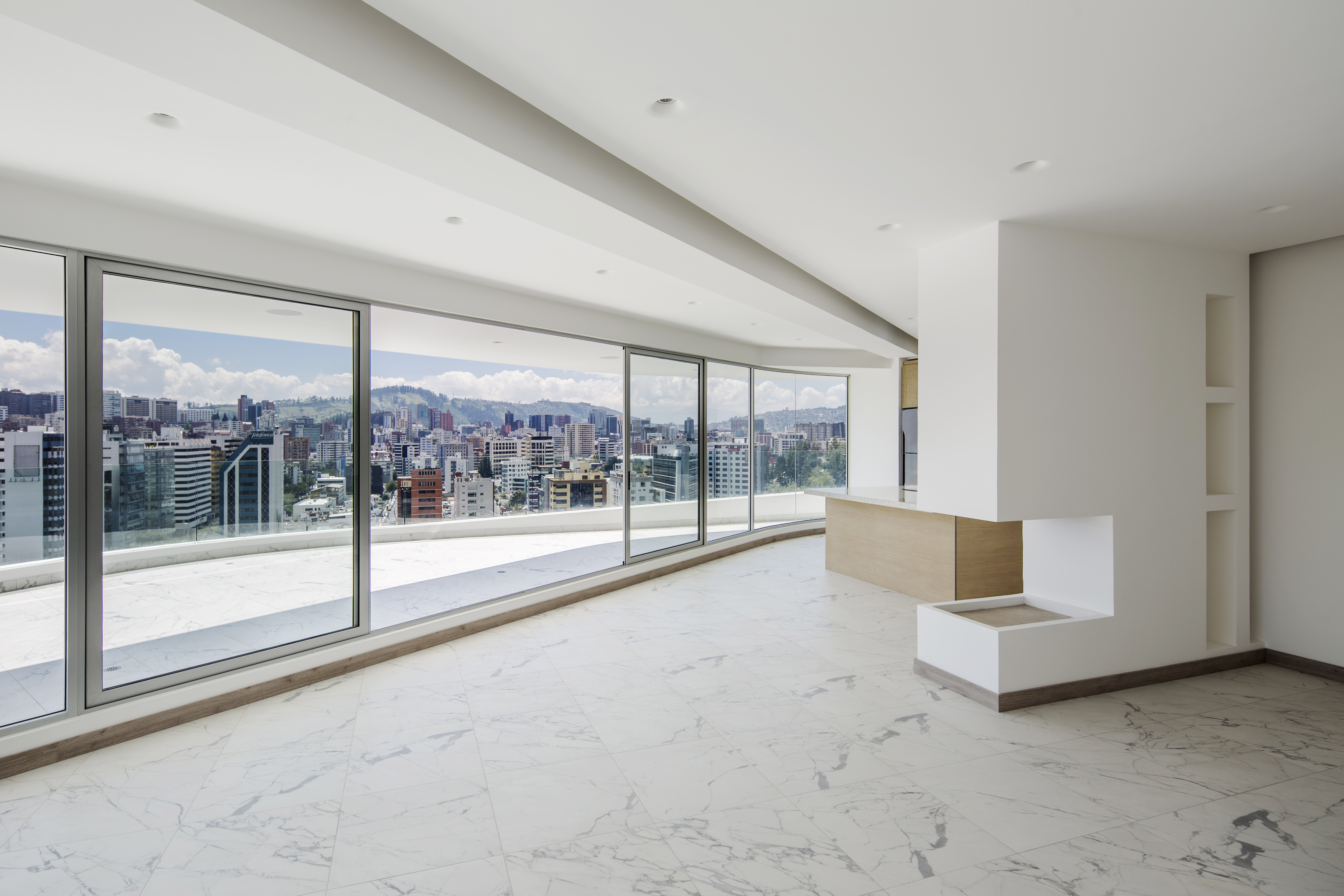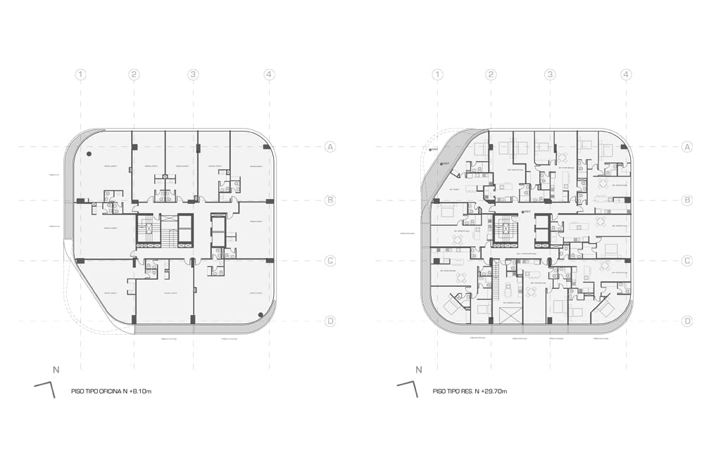 The project manages to activate these exterior areas (originally dead spaces) through different programs. The design and construction process of the building uses a system of repeatable patterns to reduce the total amount of molds used in the creation of the distinctive white facade. The façade uses a material process known as GFRC (reinforced concrete fiberglass), which is sprayed directly on the surface of the mold. The building consisting of a total of 15,000 m2 of multiple use space is crowned by a large roof garden, which is visually connected to the Andes. Together, the fifteen-story tower combines commercial opportunities on the ground floor, offices on the next four levels and residential units on the upper floor.